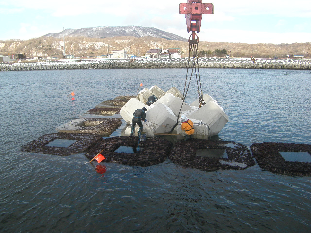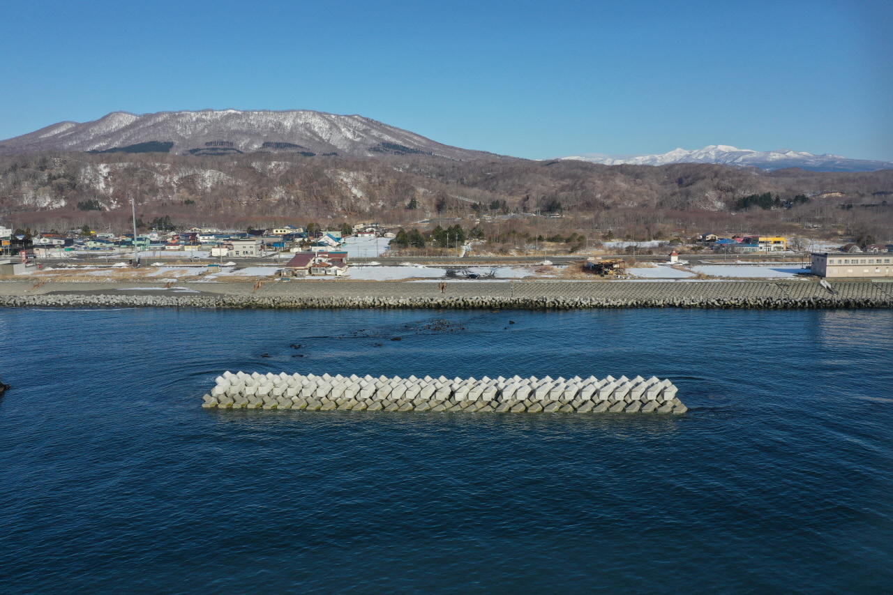 土木工事実績 ■白老海岸竹浦地区(特対)局部改良工事 ・着工日:2021.11.1 ・竣工日:2022.3.22 ・工事場所:白老町 コーケンブロック(60t)据付 コーケンブロック(45t)間隔調整 完成