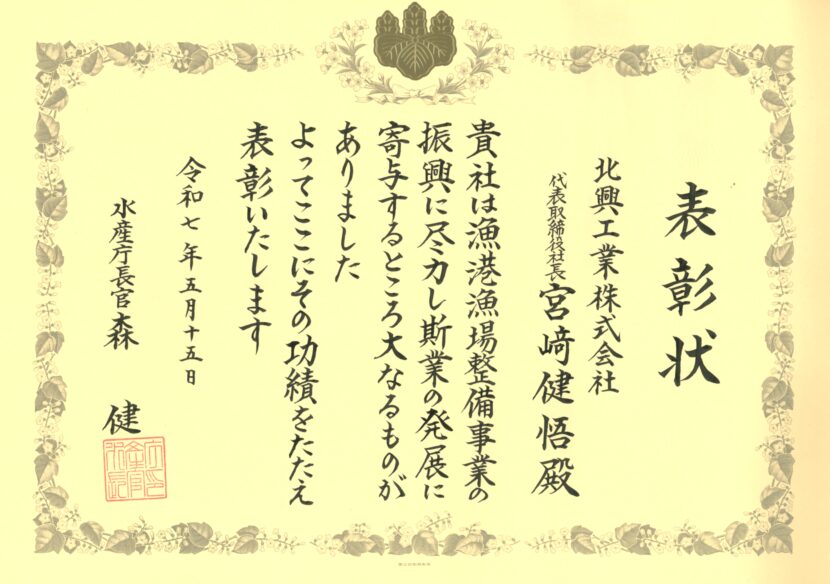 弊社は、令和7年度の『漁港漁場関係事業優良請負者表彰』を受賞いたしました。